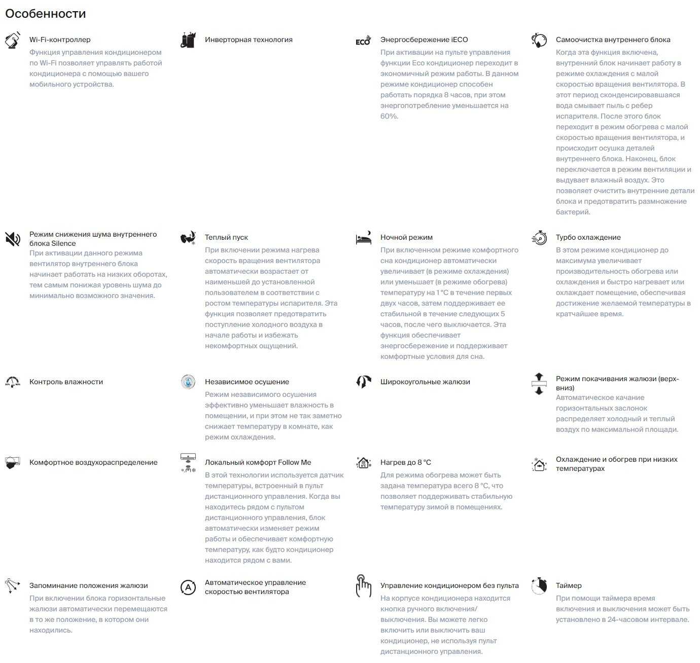 Поддерживает self-clean: сушит теплообменник перед выключением, предотвращая плесень. Качание всех направляющими создает объемный воздушный поток для равномерного охлаждения. Пользователи отмечают мягкое, бережное охлаждение без сквозняков. Режим очистки есть, но инструкция не всегда понятна. -