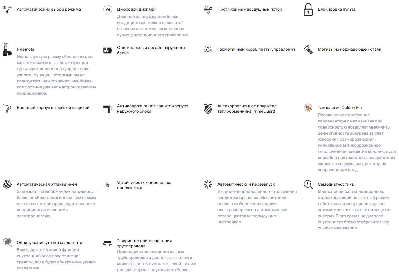 Дополнительные функции : | Follow me, автоперезапуск, ионизация, разморозка внешнего блока, самодиагностика, самоочистка внутреннего блока, система против образования льда, теплый пуск |
