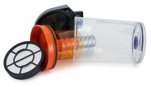 - Система циклонов предотвращает быстрое засорение фильтров — мусор компактно оседает в нижней части.