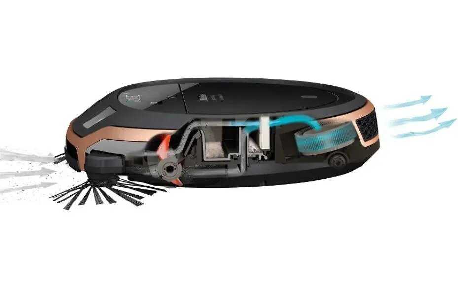 встроенные часы, гироскоп, датчик перепада высоты, дисплей, индикатор заполнения пылесборника, мягкий бампер