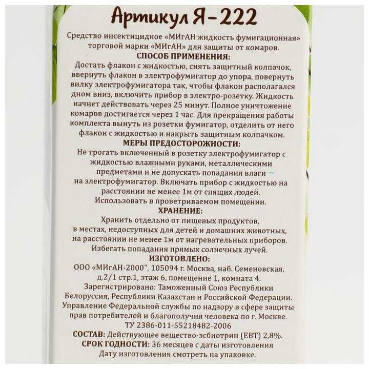 | Подробная комплектация : | Комплект от комаров электрофумигатор и жидкость Migan 30 мл / Я-474 - 1 шт. |