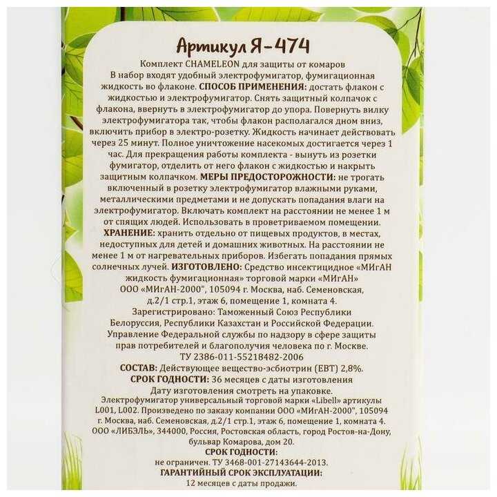 | Способ применения : | достать флакон с жидкостью и электрофумигатор. Снять защитный колпачок с флакона, ввернуть в электрофумигатор до упора. Повернуть вилку электрофумигатора так, чтобы флакон располагался дном вниз, включить прибор в электро-розетку. Жидкость начинает действовать через 25 минут. Полное уничтожение насекомых достигается через 1 час. Для прекращения работы комплекта - вынуть из розетки фумигатор, отделить от него флакон с жидкостью и накрыть защитным колпачком |