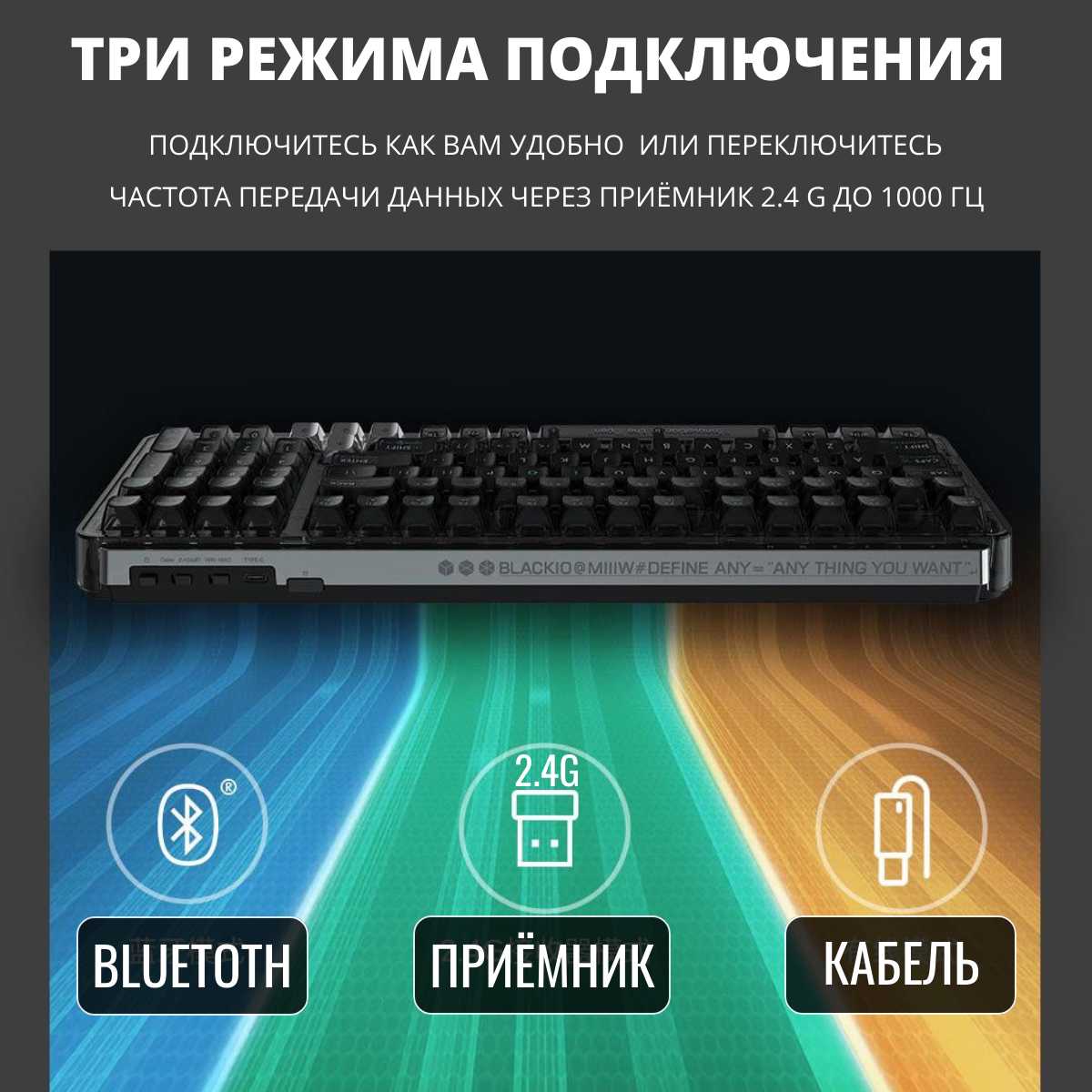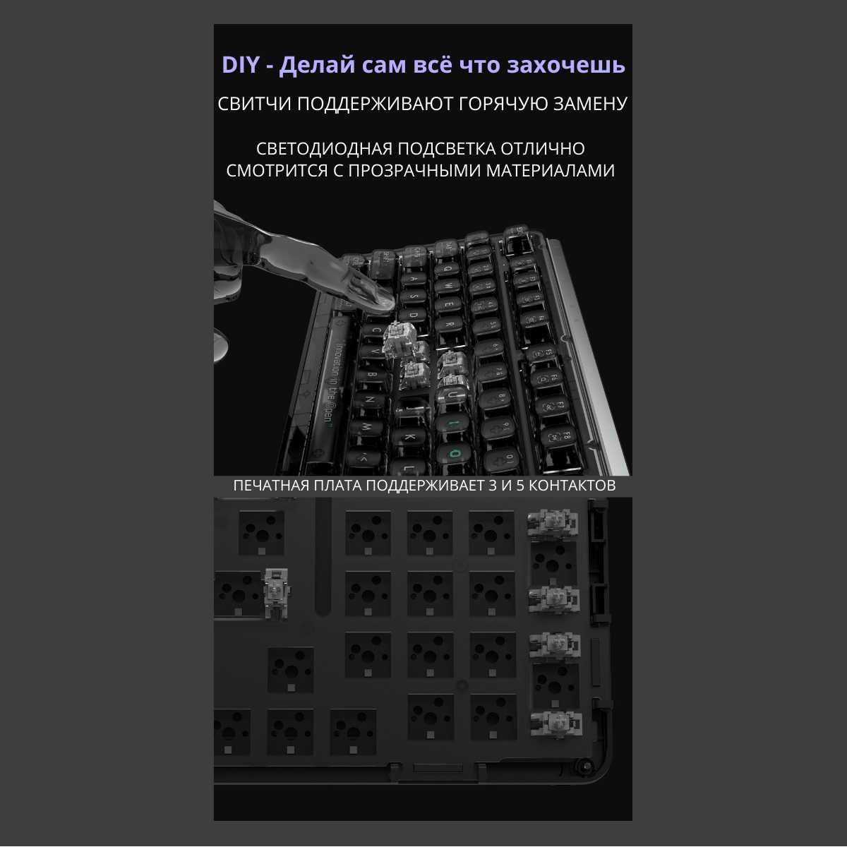 Хорошая тяжёлая клавиатура, есть отличная БЕЛАЯ подсветка клавиш с разными режимами работы и яркостью, НЕ ГРОМКАЯ механическая клавиатура, есть режимы работы по проводу, 2.4ггц модулю и блютузу. Удобно свайпать режимы работы и хоткеи. Встроенный аккумулятор. - - В целом не очень понравилась русская гравировка, лучше бы взял без нее.