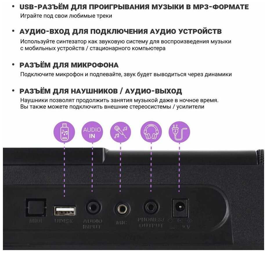 Дополнительная информация : | встроенный USB плеер, эффекты: сустейн, вибрато, транспонирование, pitch bend (изменение высоты тона), Start/Stop (включение остановка воспроизведения стиля), Synchro (функции синхронного запуска автоаккомпонимента), Fill in (функция заполнения), разделение клавиатуры, программирование |
