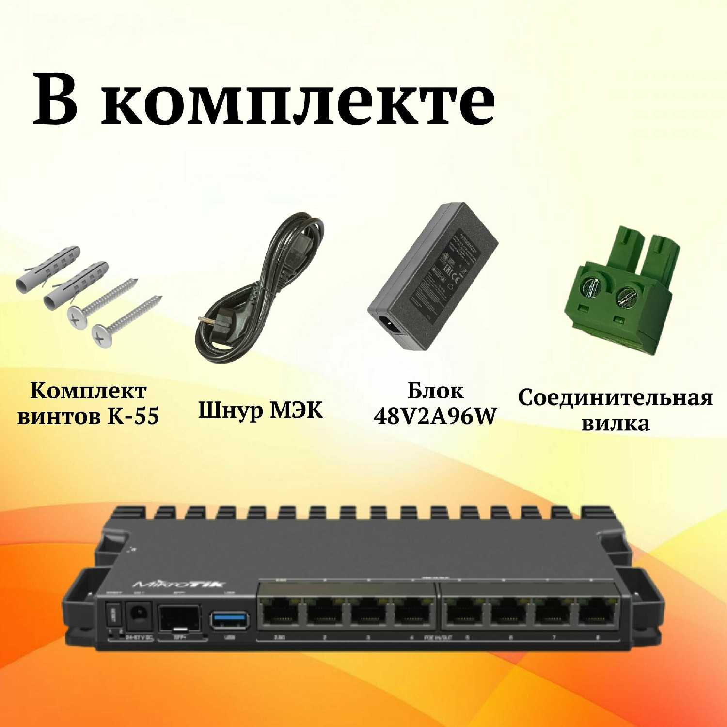 | Дополнительная информация : | Маршрутизатор RB5009UPr+S+IN - 1 шт., Блок питания 48 В, 2 A, 96 Вт - 1 шт., Набор винтов K-55 - 1 шт., Кабель питания -1 шт. |