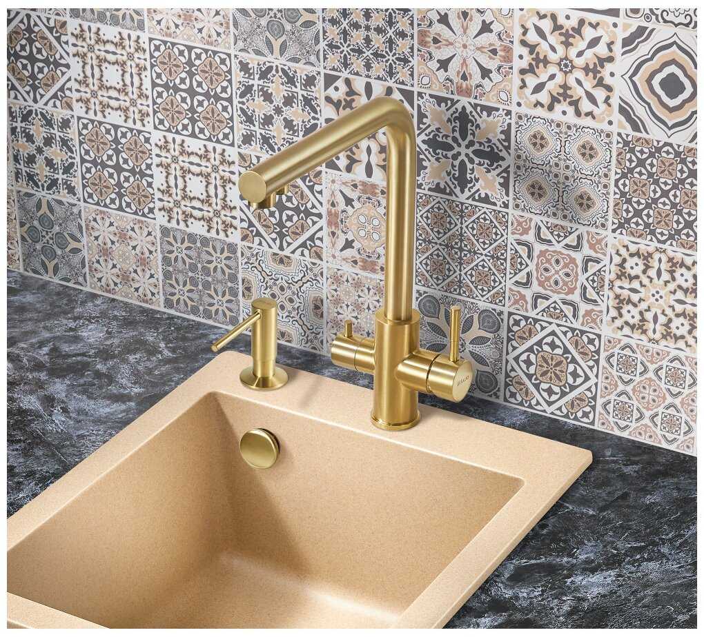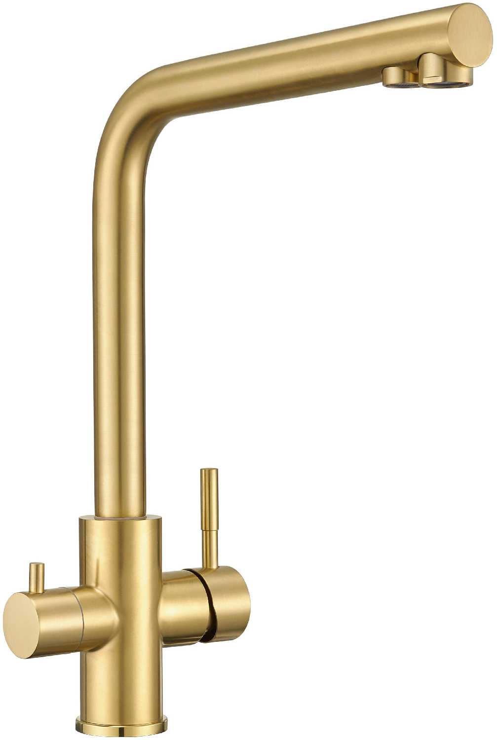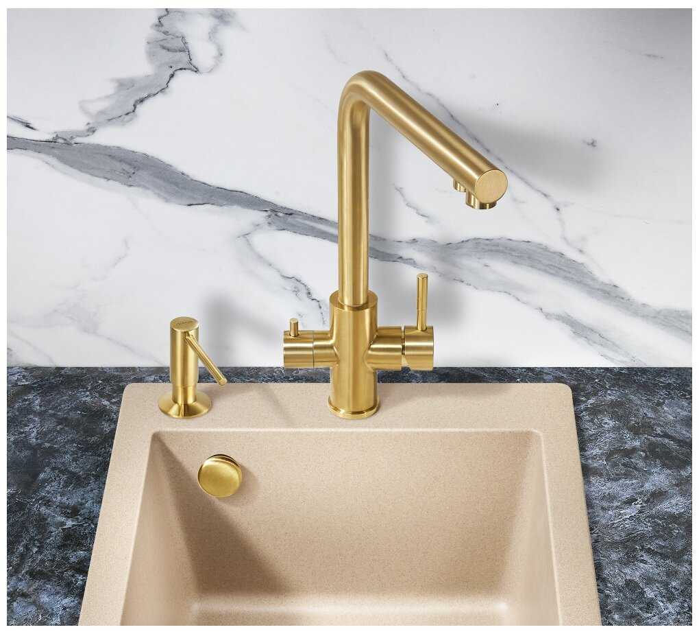 Конструкция смесителя предусматривает два отдельных канала подачи воды в одном корпусе. Отверстия для обычной водопроводной и предварительно очищенной фильтрованной воды расположены рядом, а управление осуществляется двумя рычагами по разные стороны. Такое решение позволяет организовать подачу двух типов воды без необходимости сверления дополнительных отверстий в раковине и установки отдельного крана для фильтра, что экономит пространство и сохраняет эстетику мойки. -
