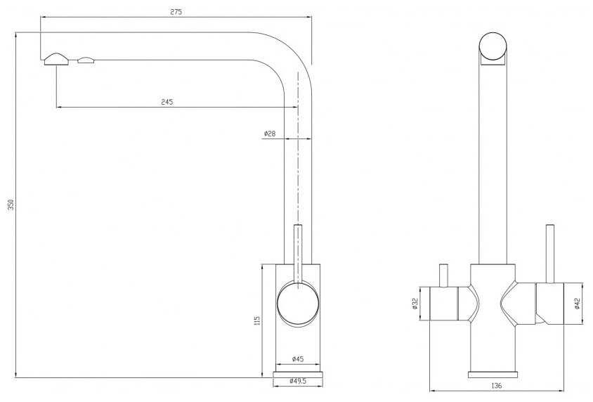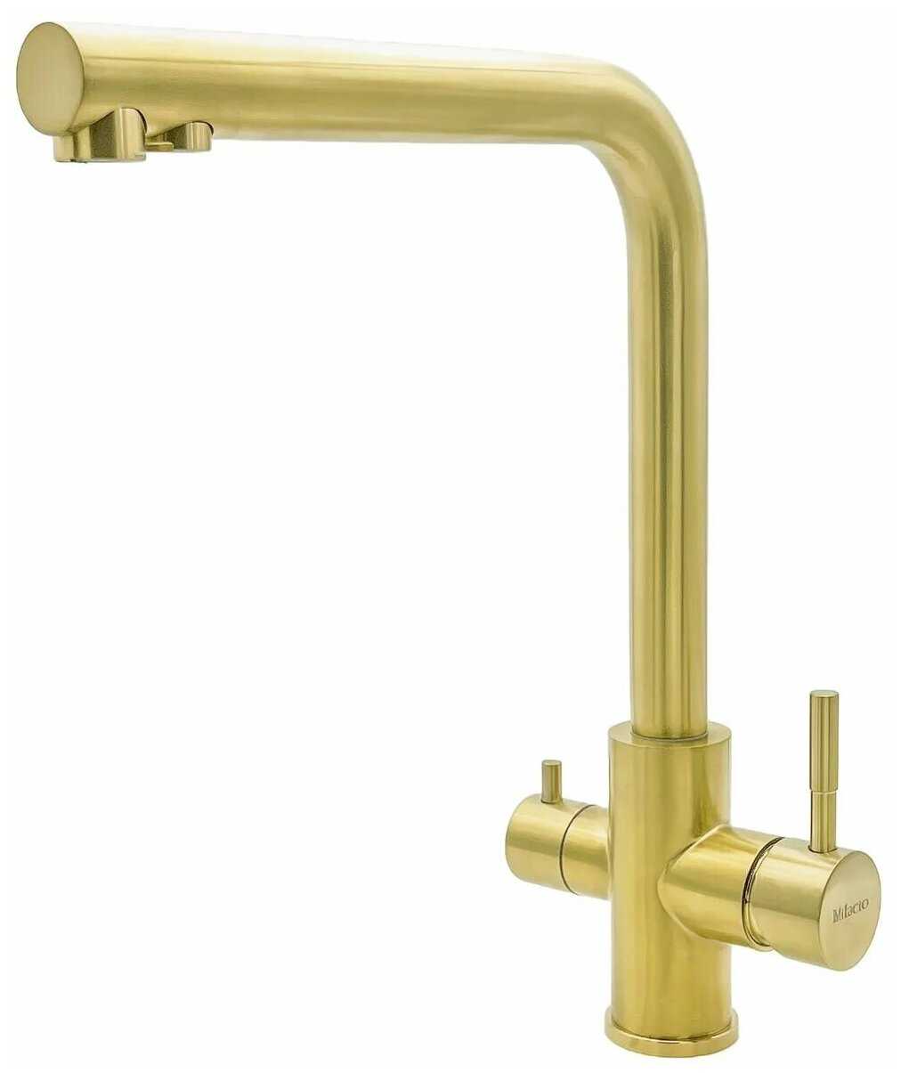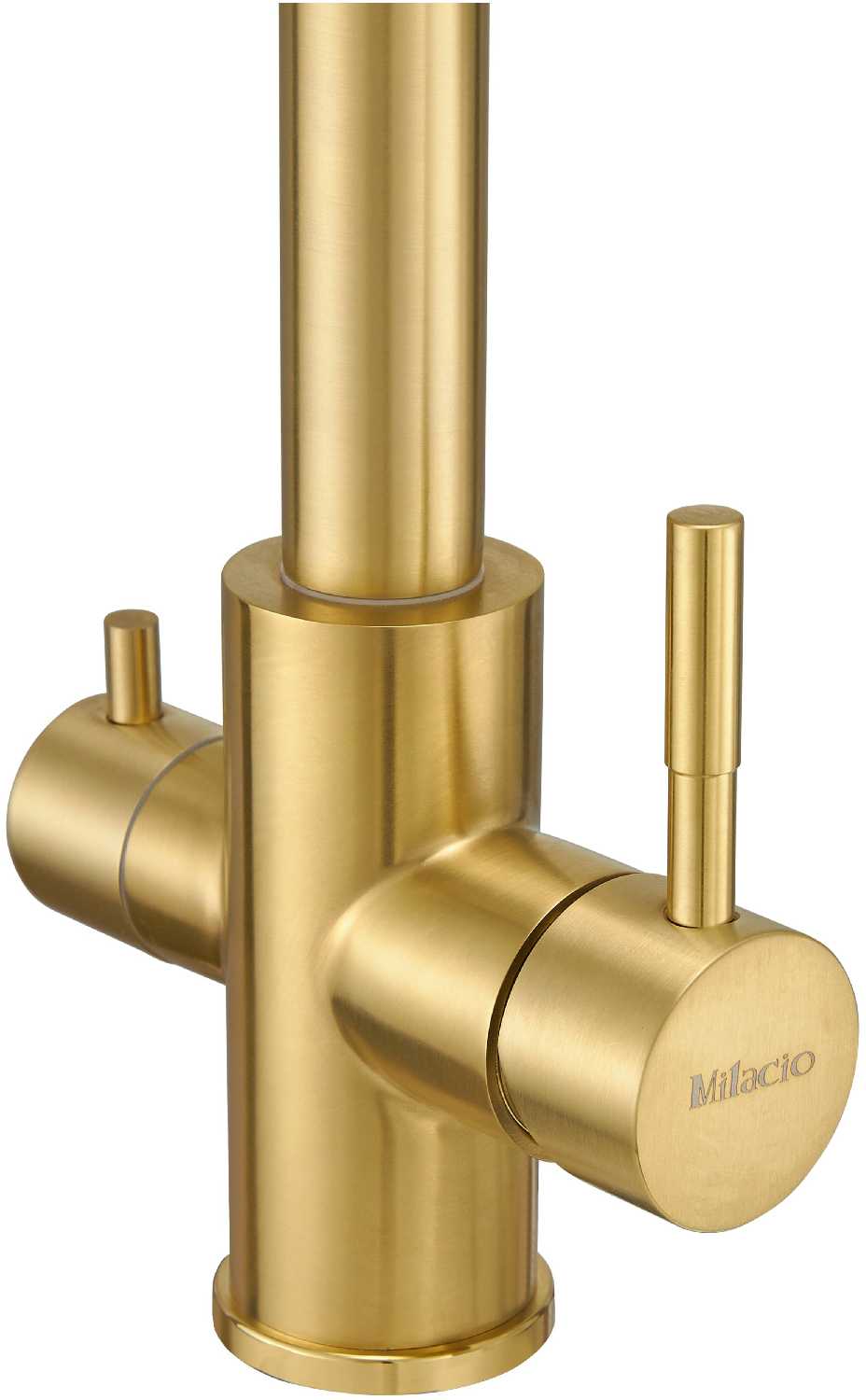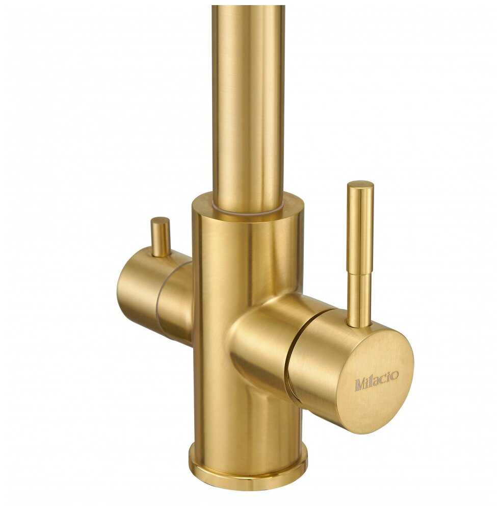 Конструкция смесителя предусматривает два отдельных канала подачи воды в одном корпусе. Отверстия для обычной водопроводной и предварительно очищенной фильтрованной воды расположены рядом, а управление осуществляется двумя рычагами по разные стороны. Такое решение позволяет организовать подачу двух типов воды без необходимости сверления дополнительных отверстий в раковине и установки отдельного крана для фильтра, что экономит пространство и сохраняет эстетику мойки. -
