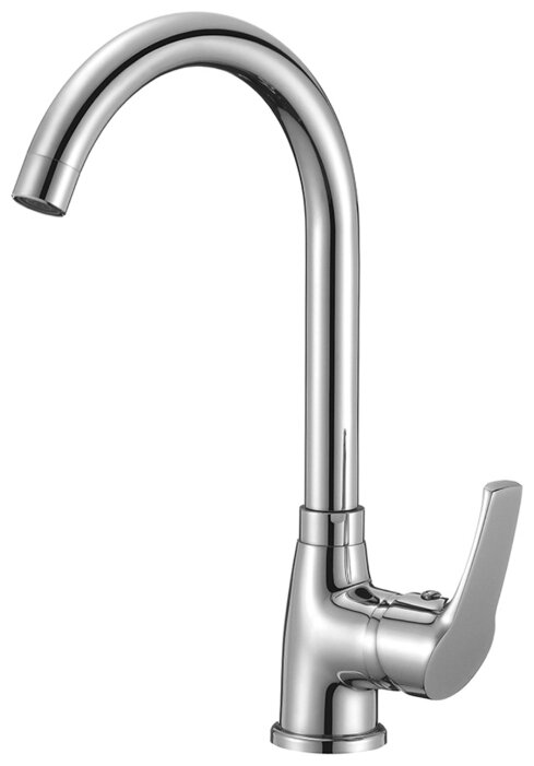 Красивый смеситель с высоким изливом. Им удобно пользоваться на кухне. Кран поворачивается плавно и им легко регулировать температуру воды. Смеситель сделан из металла и покрыт специальным покрытием. Когда кран включен, вода не разбрызгивается вокруг раковины, потому что ест специальная вставка на конце излива, она и препятствует разбрызгиванию.