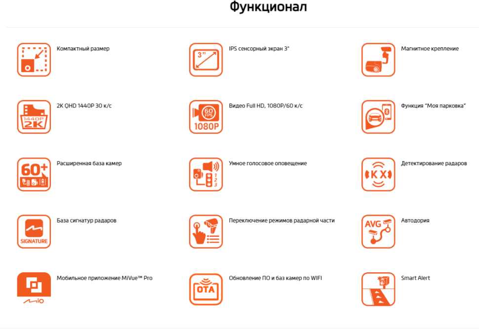 Более 60 комбинаций предупреждений о разных камерах контроля скорости (контроль обочины, камера в спину, контроль ограничения скорости и т.п.), запатентованное умное оповещение о камерах контроля скорости SmartAlert заранее предупреждает водителя, дистанция до камеры выбирается автоматически в зависимости от вашей скорости, сенсор 5Мп позволяет записывать видео в разрешении QHD 2560 x 1440 с высокой детализацией объектов в кадре, запись детализированного видео в разрешении 1920*1080 с частотой кадров 60 к/с, позволит обеспечить читаемость номеров автомобилей при более высокой скорости, при нажатии иконки “Моя парковка” в приложении MiVue Pro App, вы отмечаете местоположение автомобиля на карте, передача GPS координат осуществляется по Bluetooth, функция не доступна для отслеживания за перемещением автомобиля.