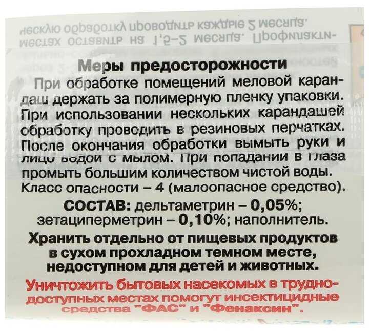 | Способ применения : | освободите часть карандаша из упаковки и держа за полиэтилен нанесите несколько полос шириной 2-4см на поверхности которые могут быть местами передвижения скопления или обитания насекомых, повторные обработки проводят по энтомологическим показаниям (при появлении насекомых) норма расхода 1 карандаша (массой 20-30г) на 20-30м2 обрабатываемой поверхности |
