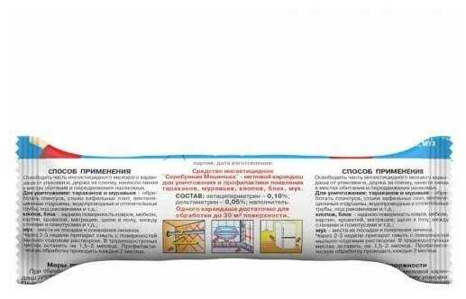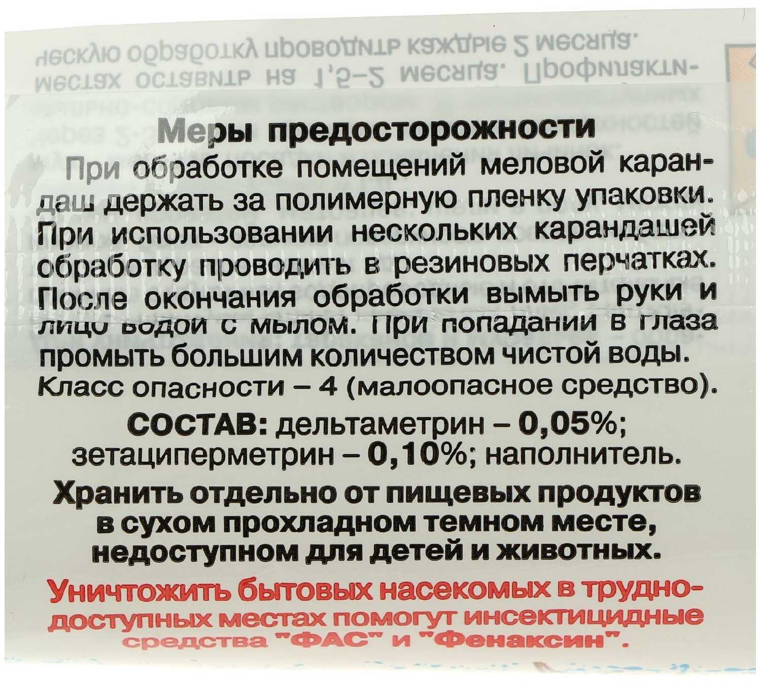 | Способ применения : | освободите часть карандаша из упаковки и держа за полиэтилен нанесите несколько полос шириной 2-4см на поверхности которые могут быть местами передвижения скопления или обитания насекомых, повторные обработки проводят по энтомологическим показаниям (при появлении насекомых) норма расхода 1 карандаша (массой 20-30г) на 20-30м2 обрабатываемой поверхности |