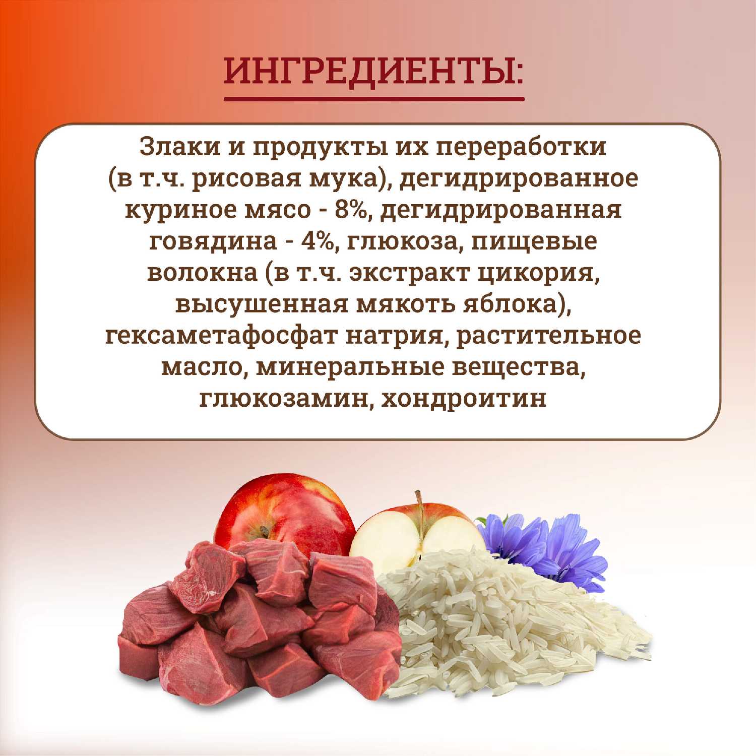 Состав : | злаки и продукты их переработки(в т.ч. рисовая мука – 26%), мясные ингредиенты (дегидрированное куриное мясо – 8%, дегидрированная говядина - 4%), глюкоза, пищевые волокна (в т.ч. экстракт цикория, высушенная мякоть яблока), гексаметафосфат натрия, растительное масло, минеральные вещества, глюкозамин, хондроитин |