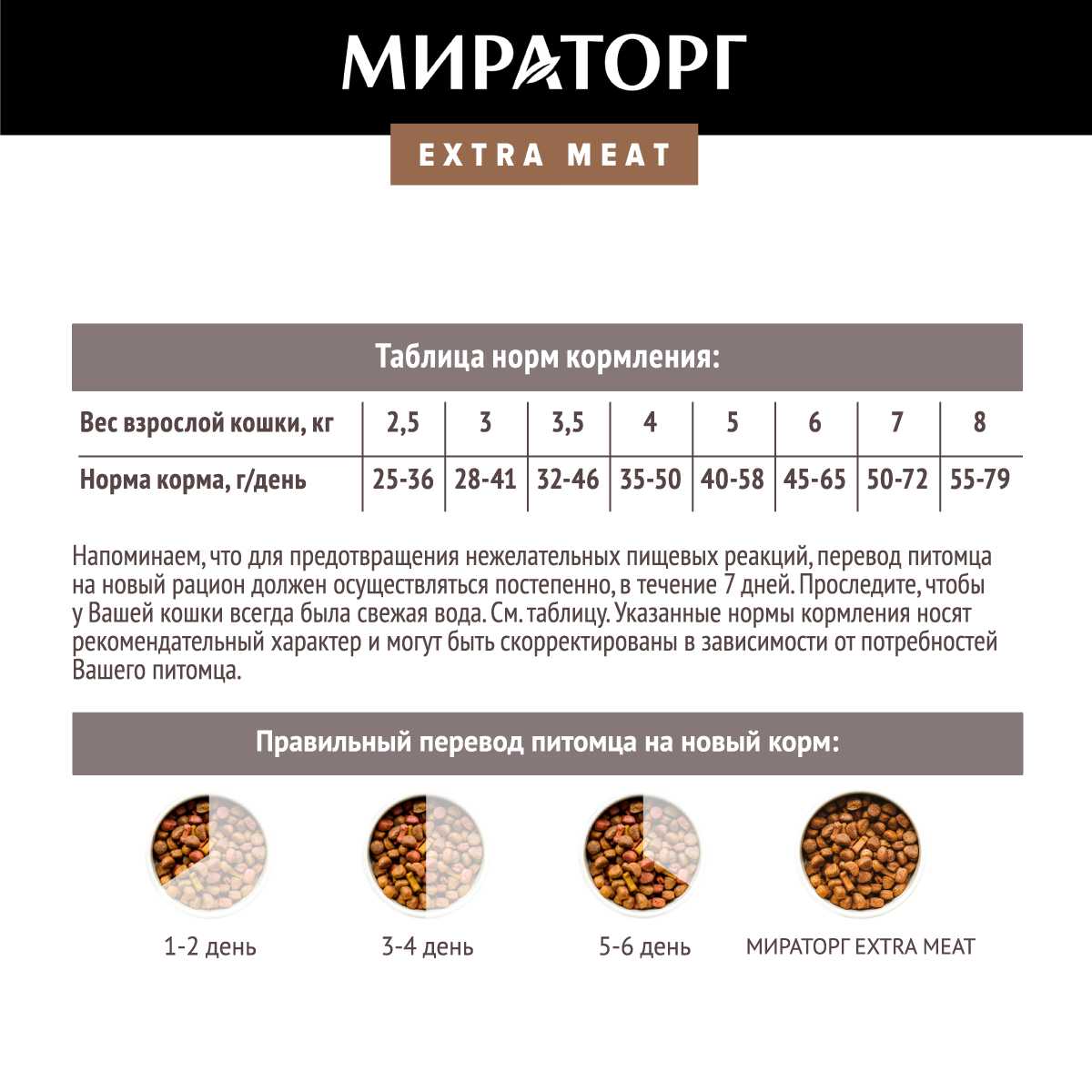 Рекомендуемые условия применения и целевая аудитория: Корм подходит определенным категориям животных при соблюдении правил использования. Оптимальные результаты наблюдаются у взрослых нестерилизованных кошек (включая возрастных – 11+ лет), неприхотливых в еде, а также для группового содержания (несколько кошек в доме) или подкормки уличных животных. Корм совместим с автоматическими кормушками благодаря структуре гранул. Ключевое требование – плавный переход с предыдущего рациона: смешивание с привычным кормом или дозированное введение для профилактики расстройств ЖКТ. При сравнении с аналогами, Мираторг позиционируется как бюджетное решение с "приличным составом" (высокий процент мяса, отсутствие вредных добавок), но уступает некоторым конкурентам в решении специфических проблем (например, для восстановления шерсти эффективнее "Микротрон"). Для привередливых животных или питомцев с чувствительным пищеварением требуется осторожное тестирование.