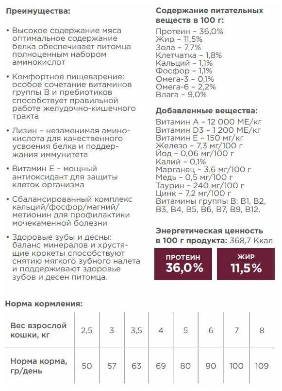 | Особые потребности : | беззерновой, гипоаллергенный, для беременных / кормящих кошек, для вывода шерсти, для живущих в помещении, для живущих на улице, для здоровья кожи и блеска шерсти, для здоровья костей и суставов, для определенных пород, для профилактики стресса, для снижения запаха стула, для стерилизованных/кастрированных, при чувствительном пищеварении, профилактика МКБ, профилактика зубного камня, профилактика избыточного веса |