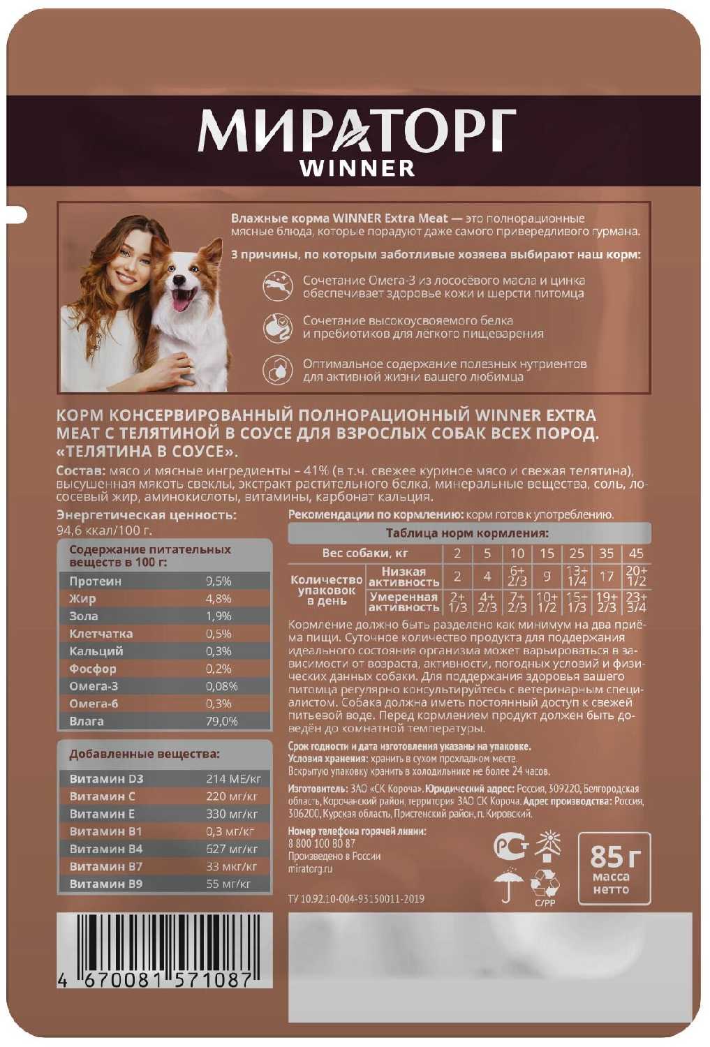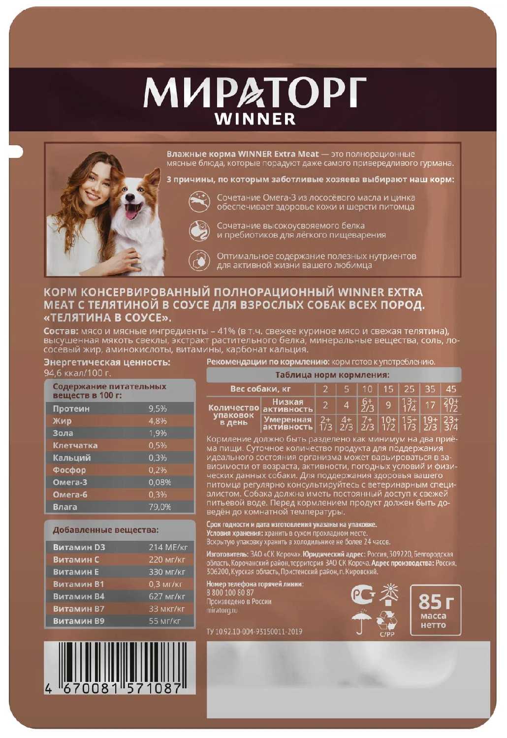 Дополнительная информация : | кормление должно быть разделено как минимум на два приема пищи, суточное количество продукта для поддержания идеального состояния организма может варьироваться в зависимости от возраста активности погодных условий и физических данных собаки, перед кормлением продукт должен быть доведен до комнатной температуры |