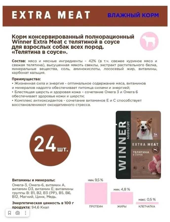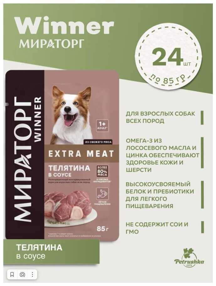 - Кусочки мяса в соусе не пересушены, что важно для пожилых собак («сочные», «не крошатся»).