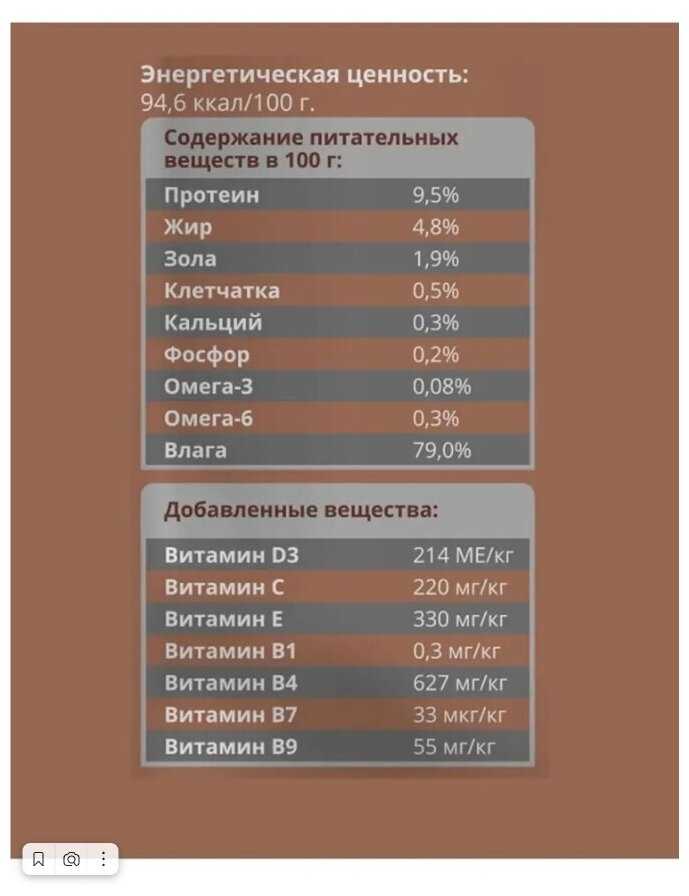 Минеральные вещества : | кальций – 0, 2%, фосфор – 0, омега-3 - 0, 07 %, омега-6 - 0, 3 % |