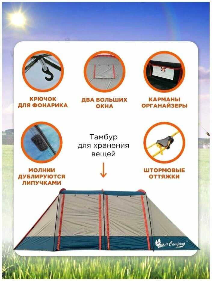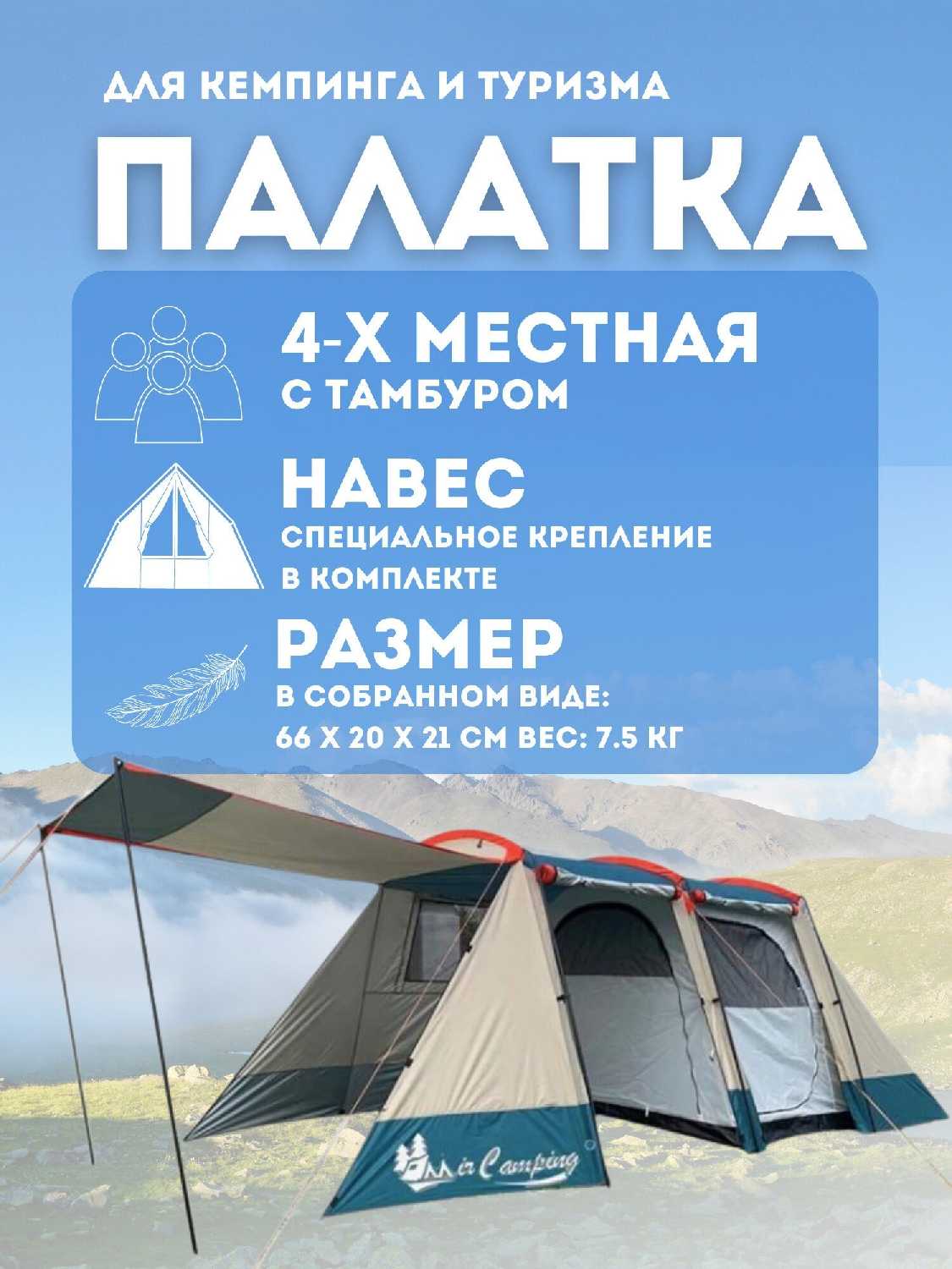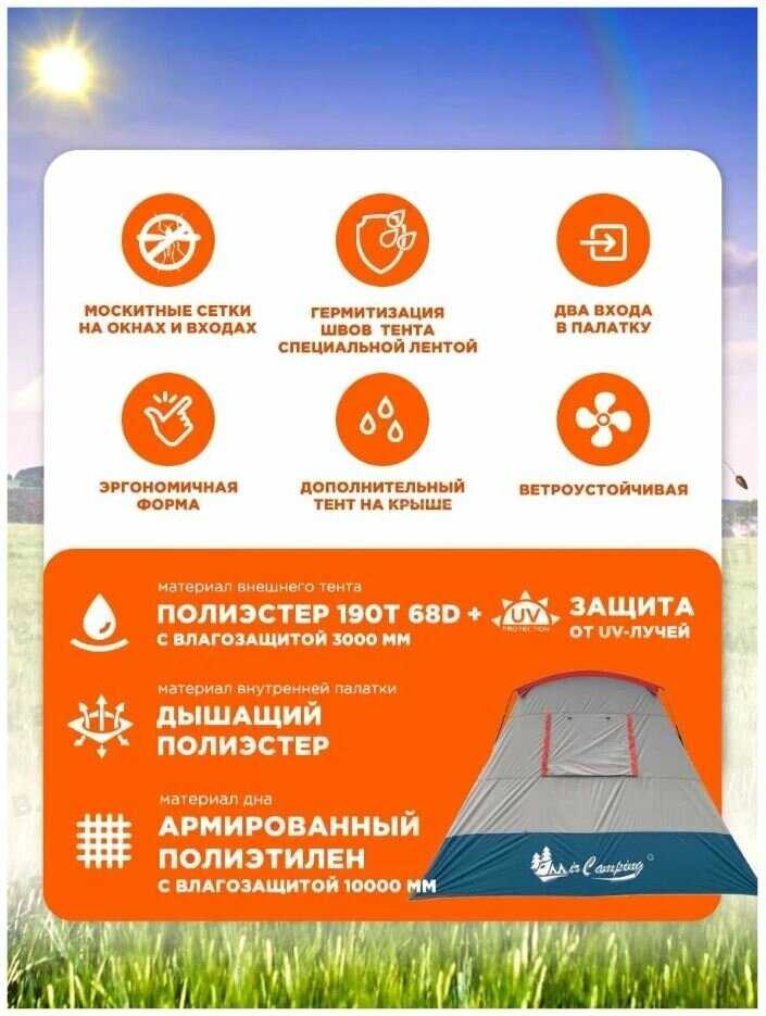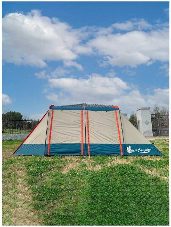 - + Большая палатка на семью, в тамбуре можно уместить небольшой стол. Три входа делают её универсальной для размещения и эксплуатации.