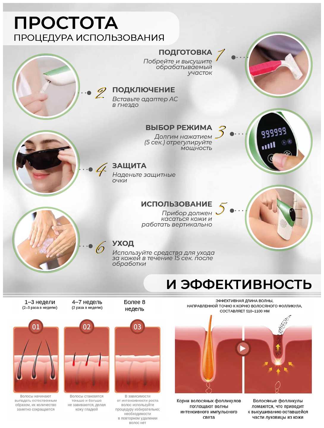 - Высокая эффективность удаления волос: