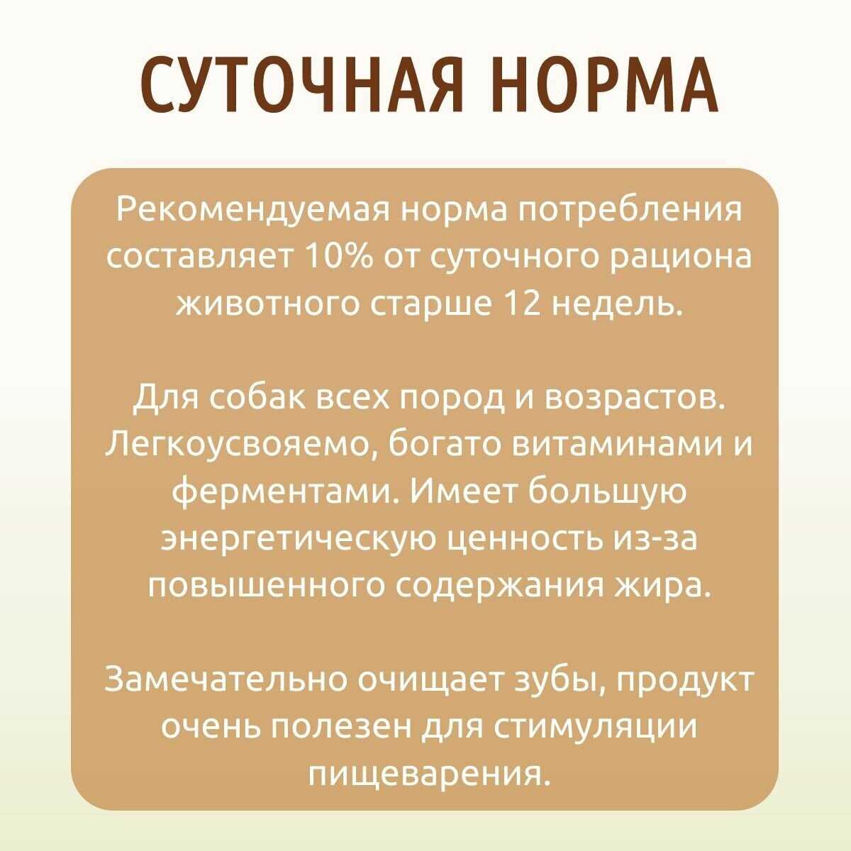 Норма употребления : | Рекомендуемая норма потребления составляет 10% от суточного рациона животного старше 12 недель. Обеспечьте Вашему питомцу доступ к свежей питьевой воде. |