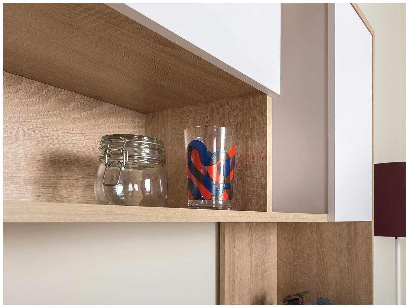 - Верхние полки не занимают пространство над столом, компактно.