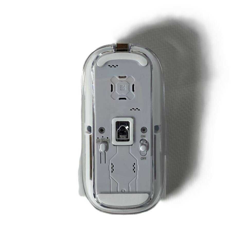 - + два устройства по BT + USB передатчик, быстрое переключение клавишей на дне мышки, классный дизайн, отключаемая подсветка, индикатор заряда