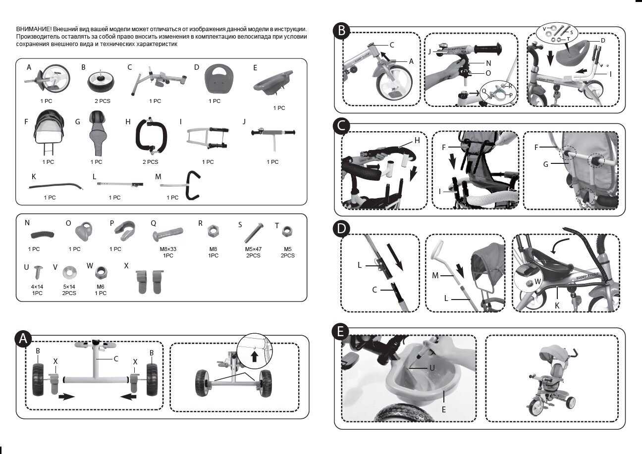 Дополнительная информация : | 3 в 1: велосипед-коляска с полным родительским управлением трёхколёсный велосипед с ручкой трёхколёсный велосипед и полное управления ребёнком, наличие переключателя «свободного хода» переднего колеса, звонок на руле, складной тент колясочного типа с фиксаторами положения, большая корзина сзади велосипеда, ножной тормоз |