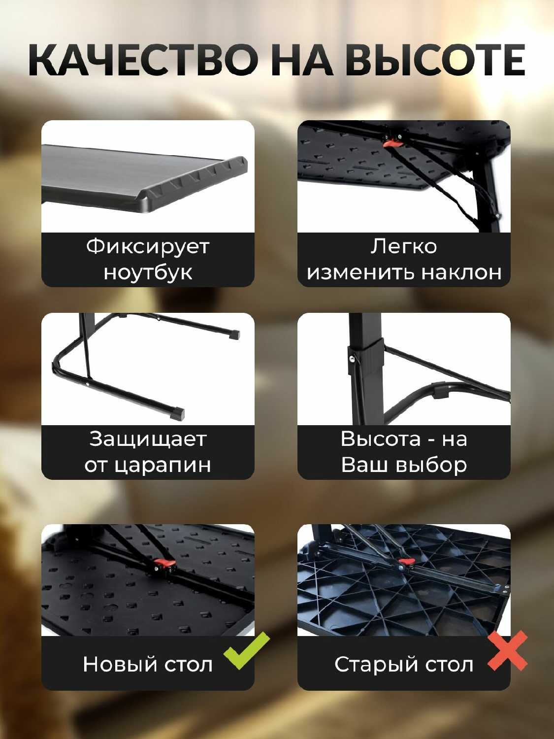 - + Удобно складывать и раскладывать, оптимальный размер, возможность регулировки по высоте и наклону столешницы