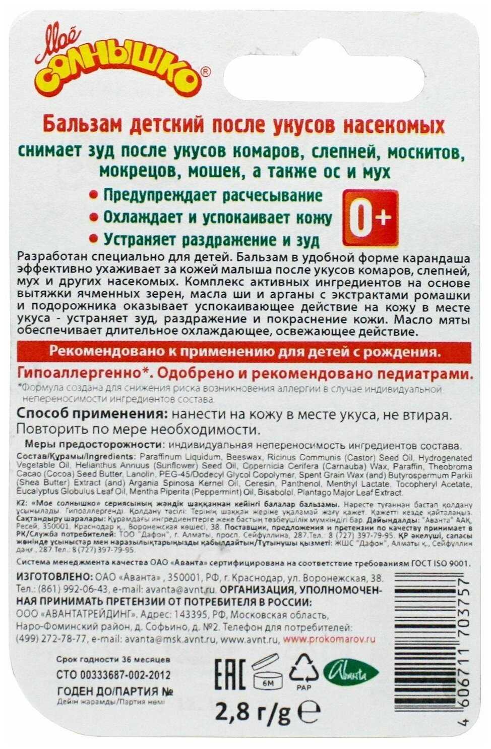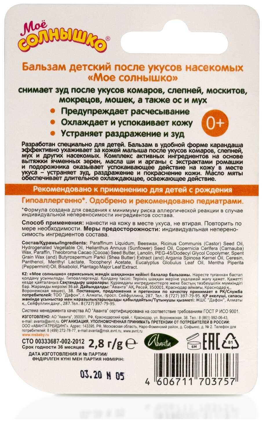 | Подробная комплектация : | Бальзам детский после укусов насекомых Моё Солнышко 2, 8 гр. |