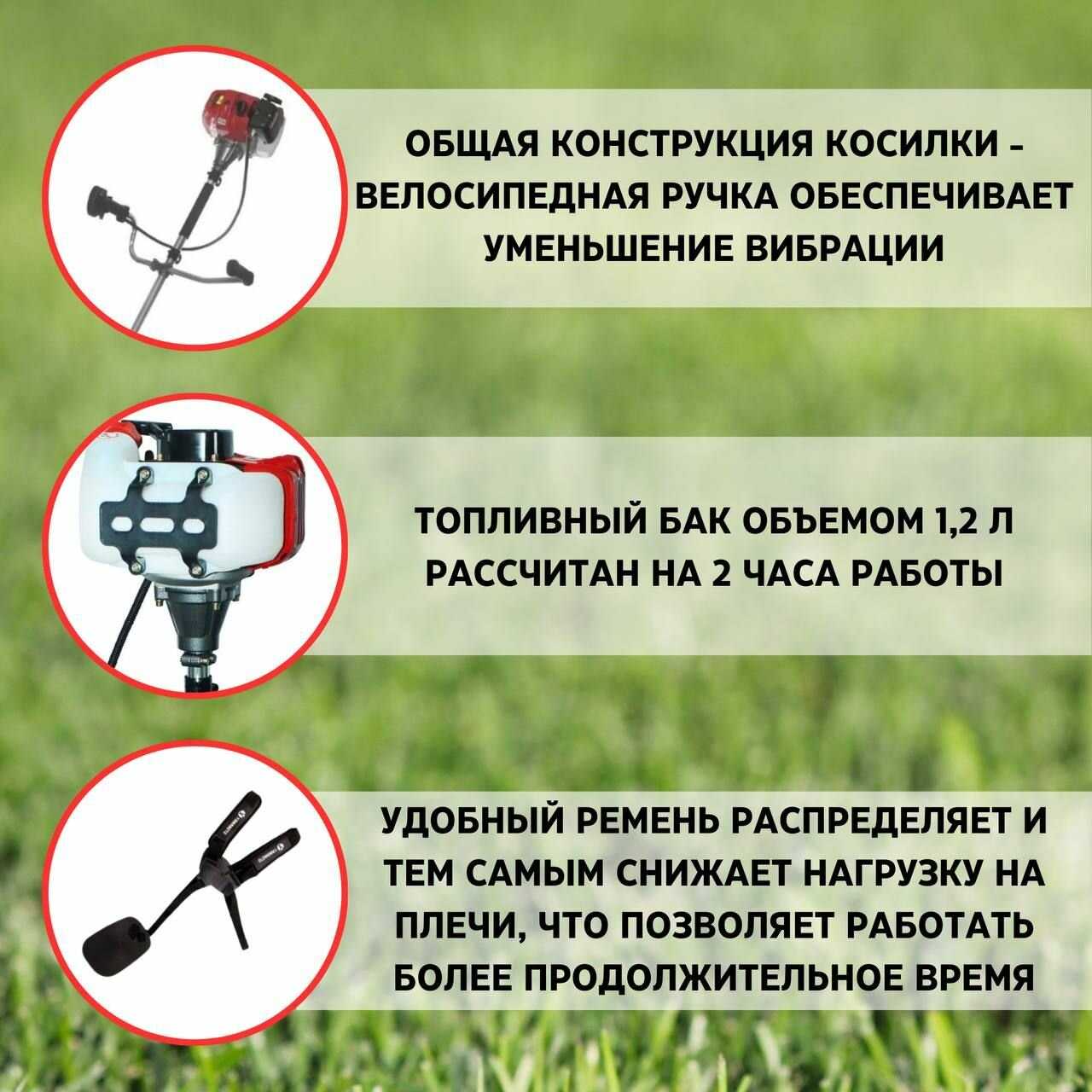 Ремень-жилетка неудобный, короткие лямки, сложно застегнуть — многие покупают другой. Регулировка ремней позволяет подогнать под рост 156 см до подмышек. Вес не чувствуется в работе. Крепление ремня к косе не самое удобное. После настройки кошение комфортное на неровностях. -