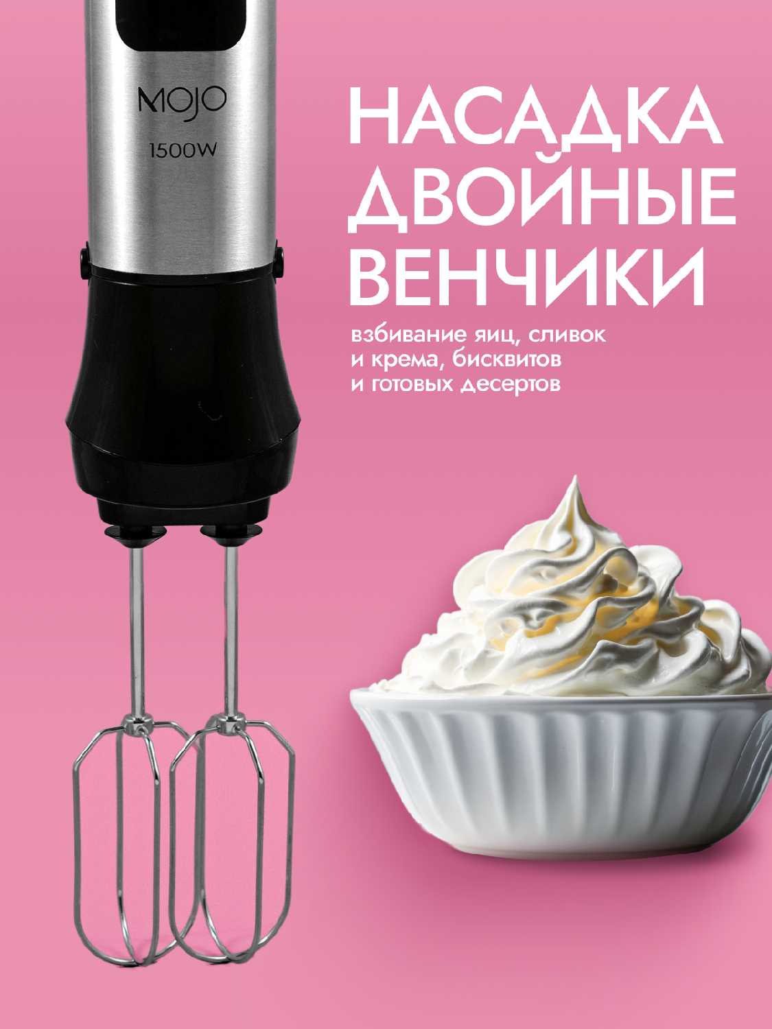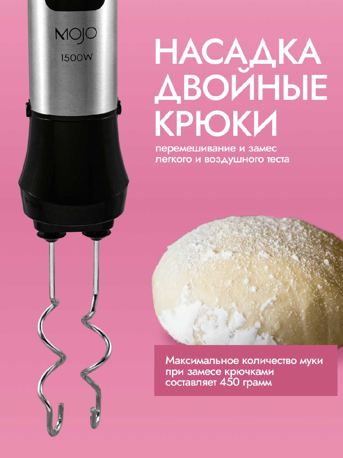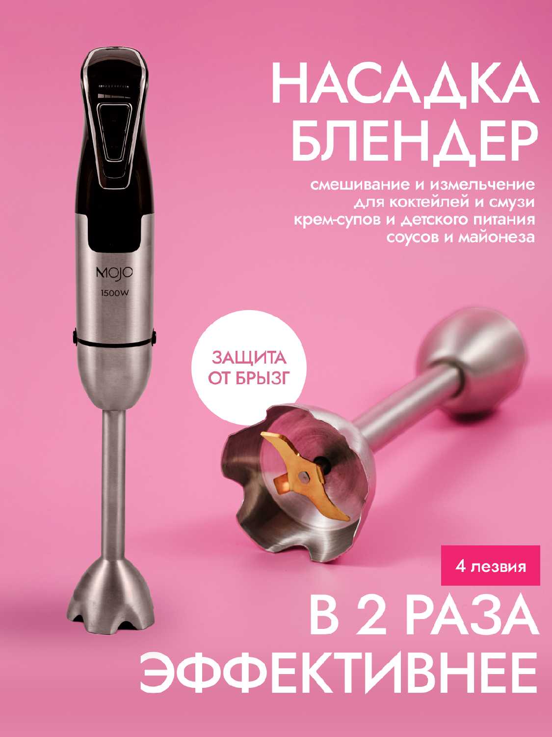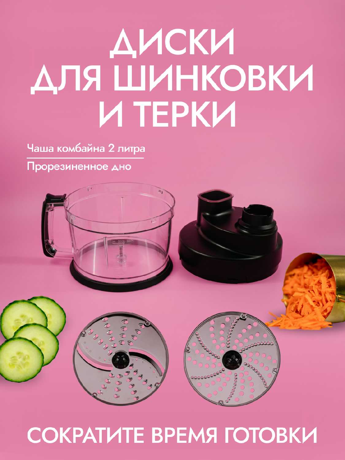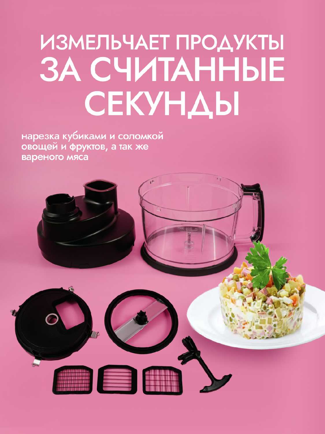 Насадки : | венчик для взбивания, диск для нарезки ломтиками, для замешивания теста, для нарезки кубиками, для приготовления пюре, измельчитель, насадка для шинковки, терка |