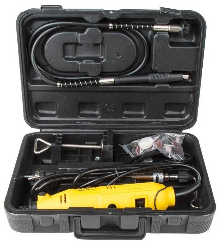 | Комплектация : | гибкий вал, штатив телескопический, набор аксессуаров, пластиковый кейс, цанги - 2 шт |
