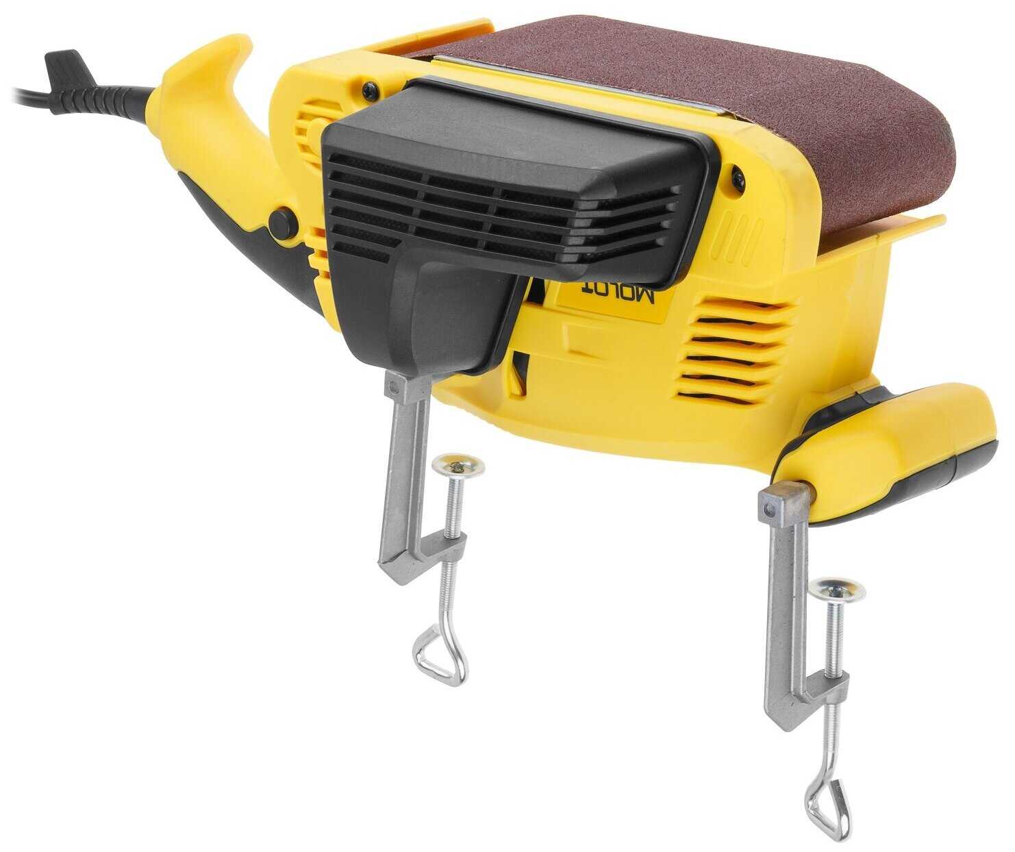 - + Регулятор оборотов, оригинальный отсек для сбора пыли,рычаг натяжения металлический а не пластмассовый и как большой плюс две струбцины. Для меня лично данные плюсы и стали поводом приобретения недорогой ленточной шлифмашины Молот. Сколько она проработает, не знаю. Покупкой доволен.