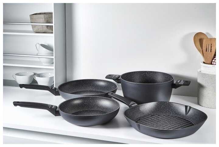 - Вес 1.2 кг (для 24 см) обеспечивает устойчивость на плите без излишней нагрузки на запястье.
