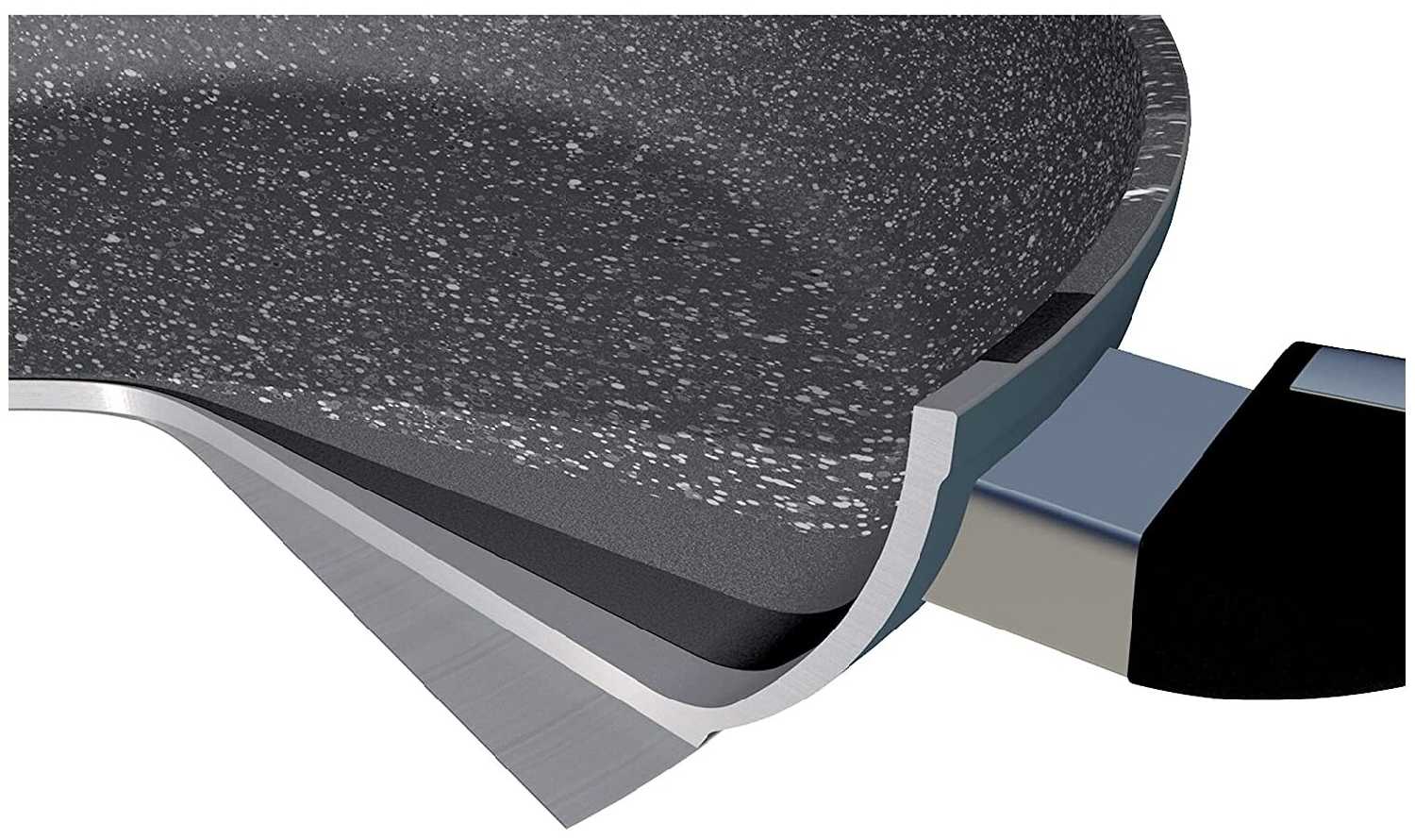 Конструктивно сковорода адаптирована под современные кухни. Совместимость с индукционными плитами обеспечивается ферромагнитным диском толщиной 4 мм, который также способствует равномерному распределению тепла. Это подтверждают пользователи, отмечающие отсутствие «холодных зон» при жарке блинов. Высокие бортики (до 5 см) и литой алюминиевый корпус делают ее пригодной для тушения и томления, хотя деформация дна у крупных моделей остается проблемой. Производителю стоит доработать термообработку сплава, так как 15% рецензентов столкнулись с «короблением» через 2–3 месяца активной эксплуатации.