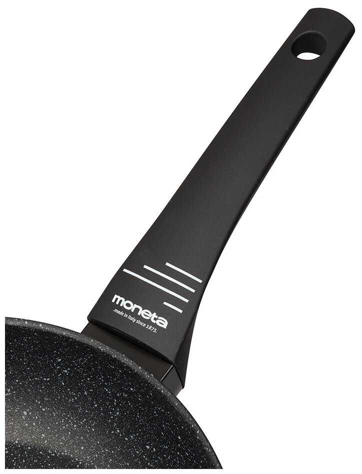 - Металлическая ручка с противоскользящим покрытием позволяет безопасно перемещать сковороду, в том числе в духовку.