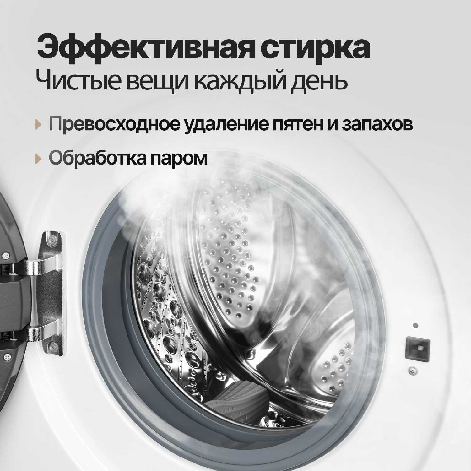 - Технический параметр: увеличенный диаметр барабана предотвращает сминание тканей и обеспечивает равномерное распределение белья.