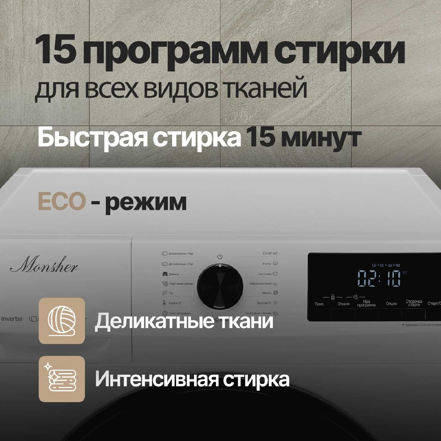 Надежность и Качество Сборки: Надежность машины подчеркивается в отзывах, описывающих сроки эксплуатации от нескольких месяцев до года и более ("8 месяцев - полет нормальный", "год использования - ни единой нарекания", "третий месяц - нареканий нет"). Пользователи отмечают качественную сборку, отсутствие посторонних запахов после первой стирки (при использовании спецсредства для запуска) и общую добротность конструкции. Наличие двухлетней гарантии и репутация производителя (часто упоминается в контексте другой купленной техники Monsher) добавляют уверенности в долговечности. Машина позиционируется как "рабочая лошадка", способная выдерживать ежедневные стирки больших объемов.
