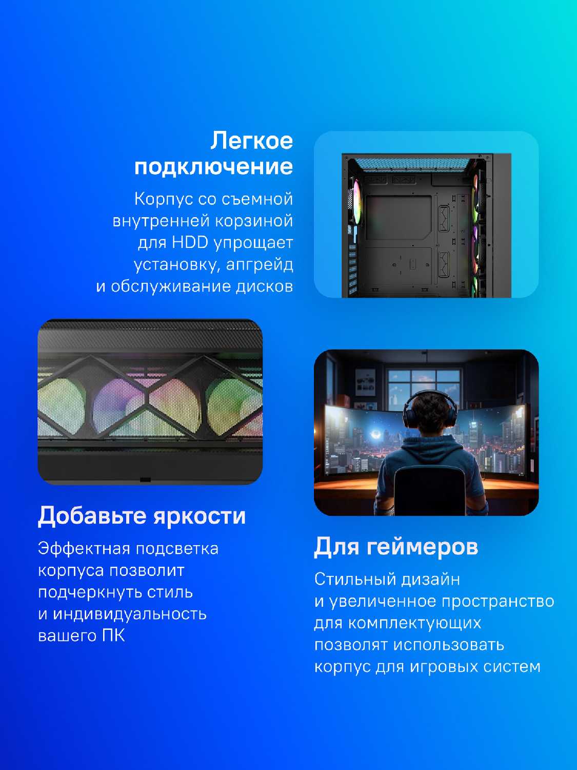 - Три фронтальных вентилятора 140 мм и один тыловой 120 мм обеспечивают сквозной продув, снижая температуру CPU/GPU на 10-15°C.
