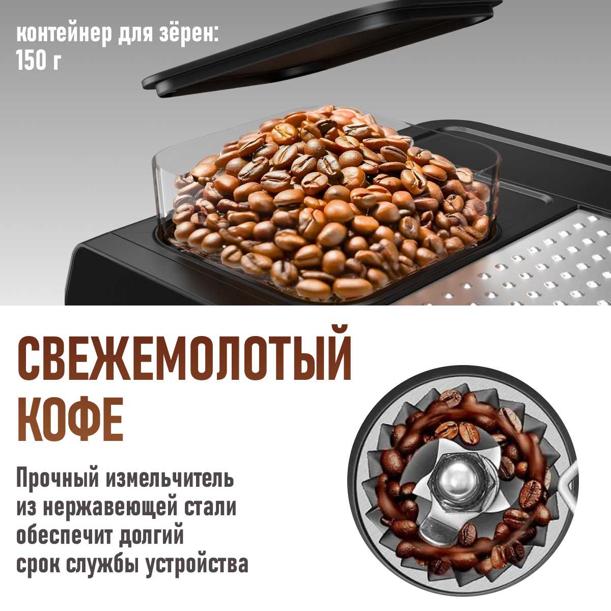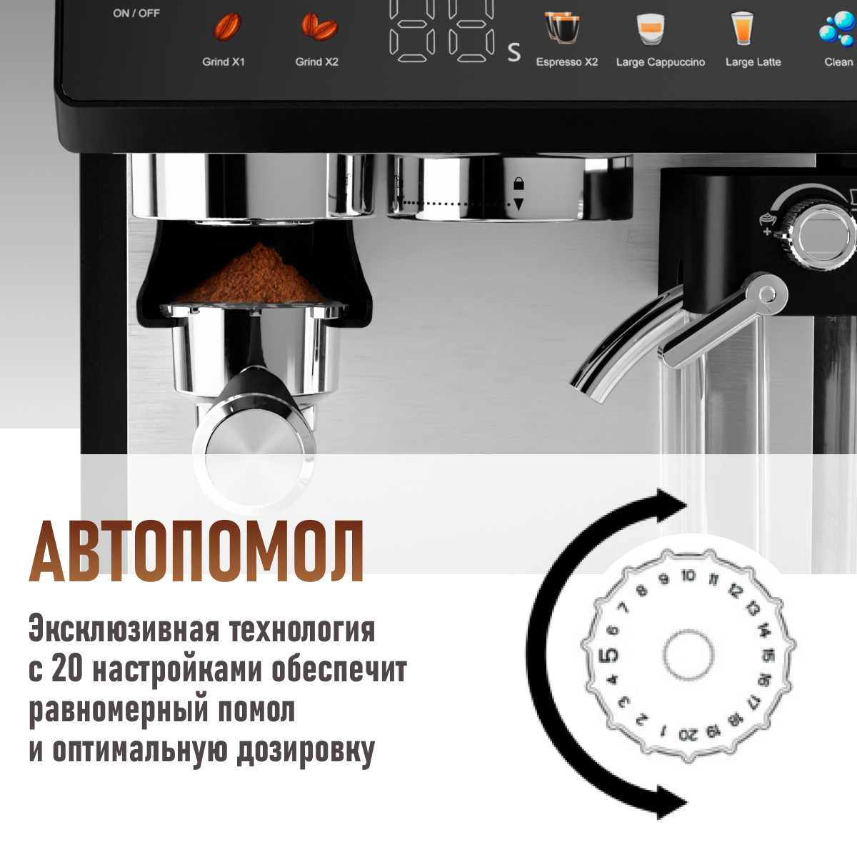 - Регулируемый держатель рожка адаптируется под разный объем молотого кофе (7-9 г).