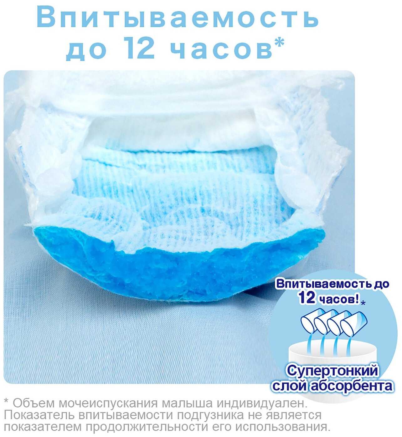 - Хорошо впитывают жидкость, держат всю ночь (до 9-12 часов) без смены, даже при большом объеме, оставляя кожу ребенка сухой внутри.