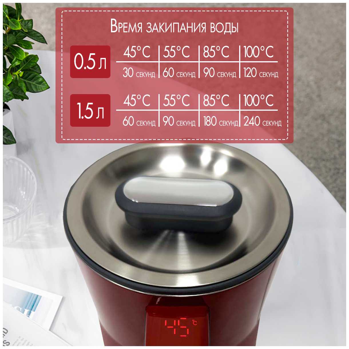 Чайник нагревает воду до 100°C примерно за 4 минуты, что пользователи считают оптимальным для его мощности и объёма. Скорость нагрева до более низких температур (например, 45°C или 80°C) ещё выше — это удобно для быстрого приготовления детских смесей или травяных напитков, не требующих кипятка. -