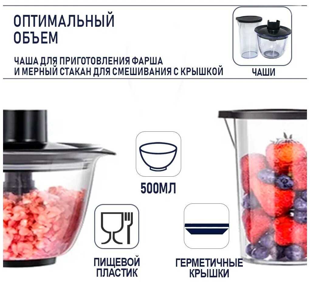 Дополнительная информация : | Комплектация: блендер (моторный блок) - 1 шт, насадки - 4 шт (чеснокочистка, венчик, насадка-блендер, нож 4 лезвия), стакан с крышкой 0, 5л, чаша измельчителя 0, 5л. В зависимости от партии поставляется с евровилкой или европереходником. Гарантия на товар по чеку 1 год (чек на эл. почте). Инструкция на русском языке по QR коду (указан на коробке). |