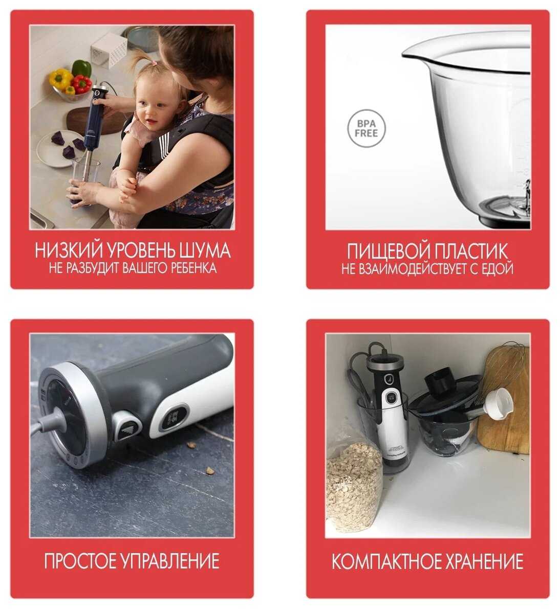 Блендером полностью довольна. Венчик отлично быстро взбивает, пюрешку махом делает, измельчает как надо. Ножи острые, мыть удобно после готовки. Запаха пластмассы не было