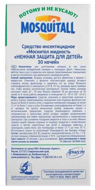 | Подробная комплектация : | Жидкость для фумигатора от комаров Нежная защита для детей 30 ночей, 30 мл |