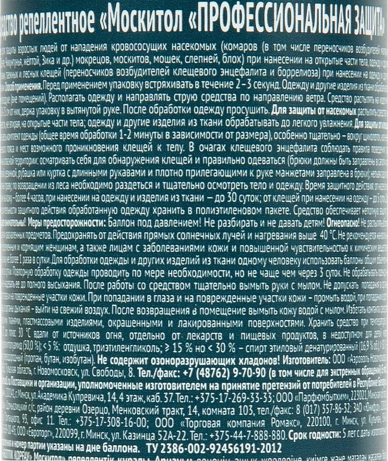 | Состав : | диэтилтолуамид(500%), <5%:отдушкатриэтиленгликоль, ≥15%но<30%-спиртэтиловыйденатурированный(169%об.)., ≥30%-пропеллентуглеводородный(пропанбутанизобутан). |