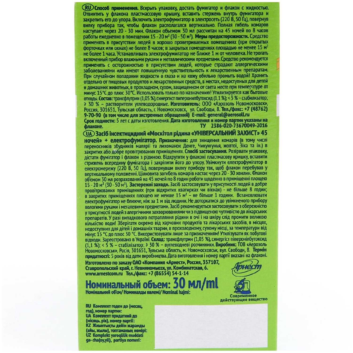 Подробная комплектация : | Фумигатор, жидкость на 45 ночей |