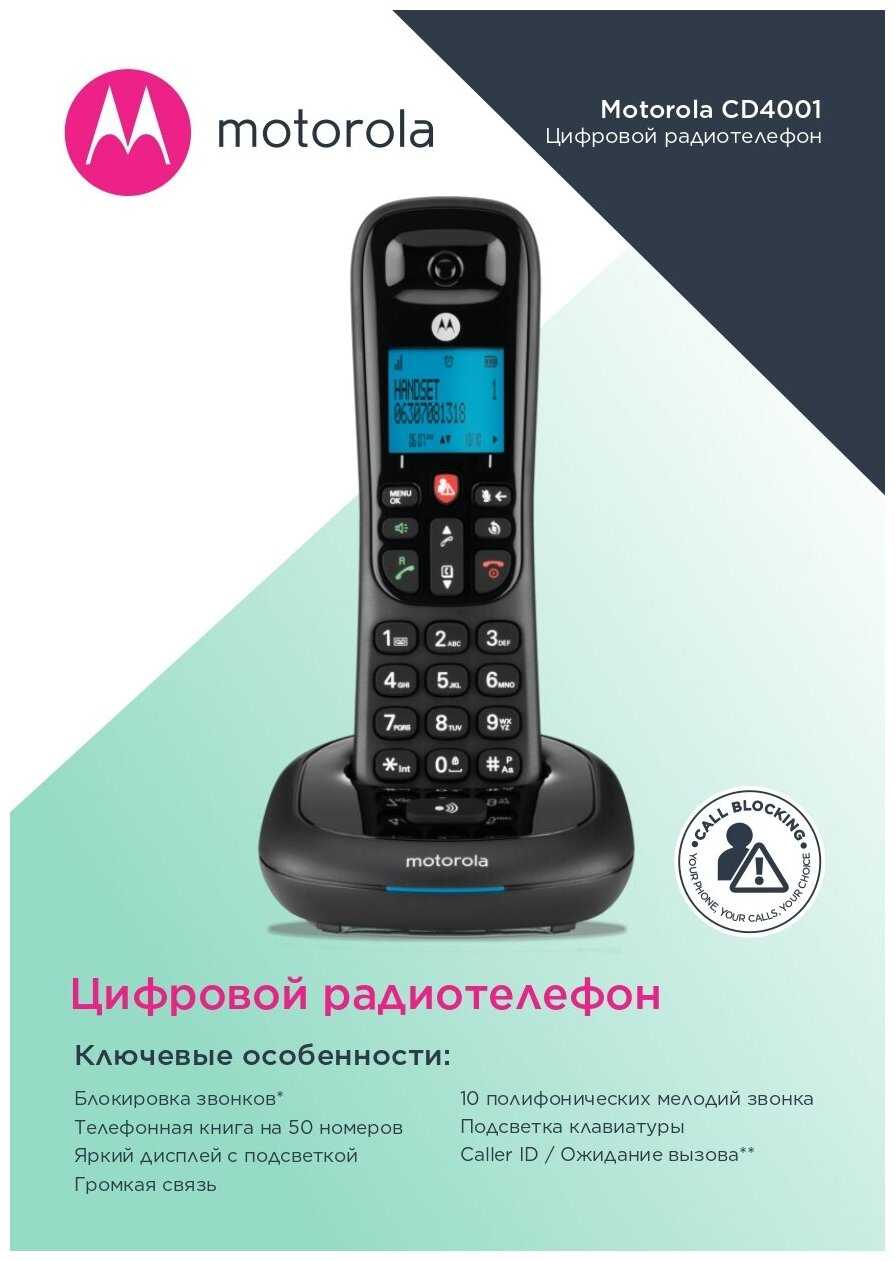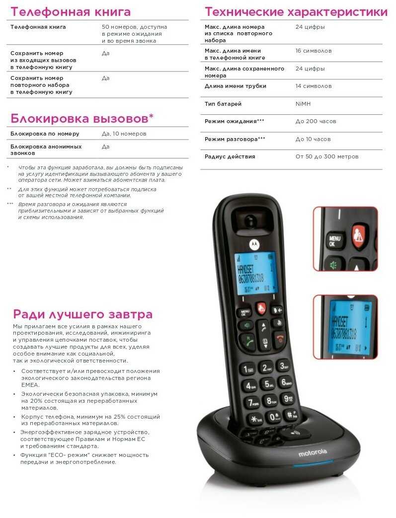 - + Одна кнопка ответа на звонок и положить трубку, это было важно, так как брали для пожилого человека. Бренд моторола, две трубки, экран, телефонная книга, определитель номера Caller ID, подсветка дисплея, хорошая слышимость, часы.