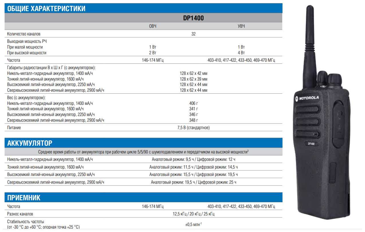 Дополнительная информация : | Рация Motorola DP1400 UHF MDH01JDC9JA2AN, аккумулятор PMNN4251AR NiMH 1400 мАч, антенна портативная PMAE4016A, зарядное устройство WPLN4137BR типа "стакан", адаптер питания AA26990L, клипса HLN8255B, документация. |