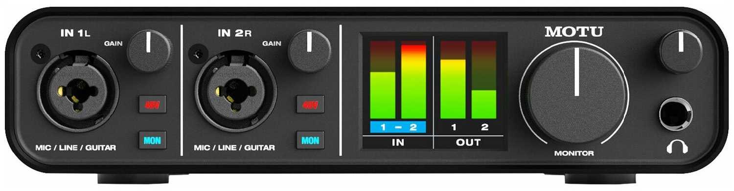 Комбинированные XLR/TRS-входы 1/2 оптимизированы для микрофонов и инструментов, но не являются полноценными линейными. Для подключения внешних преампов или процессоров рекомендуется рассмотреть Motu M4, где входы 3/4 имеют линейный уровень. В M2 сигнал с линейных источников требует корректировки гейна. -